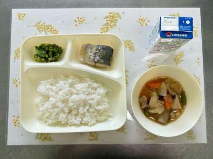 今日の献立は、さごしのおろしじょうゆかけ・さといもと野菜の含め煮・なのはなのおひたし・ごはん・牛乳です。