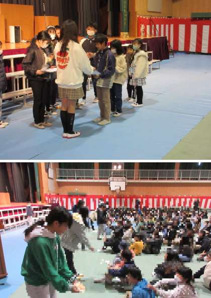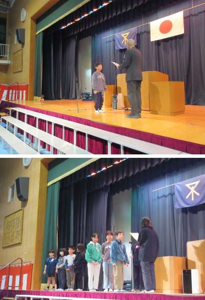 最初に、男子井高野ミニバスケットボールクラブが大会で3位になった表彰の伝達と、読書週間でたくさん本を読んだ児童の表彰が行われました。