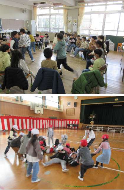 (写真上)2年生は教室や体育館で楽しくゲームをしていました。