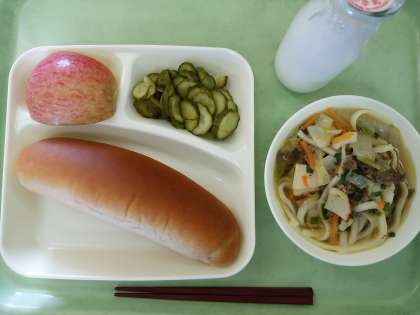 パン・牛乳・肉うどん・きゅうりの甘酢づけ・りんごです。