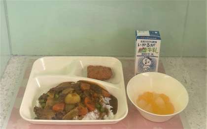 今日の献立は、入学お祝い献立のカツカレーライス・フルーツゼリー・ごはん・牛乳です。