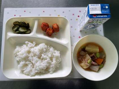 今日の献立は、まぐろのオーロラ煮・豚肉と野菜の煮もの・きゅうりの赤じそあえ・ごはん・牛乳です。