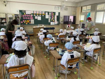 まぐろのオーロラ煮は、一口サイズのまぐろをカラッと油で揚げて甘辛いケチャップ風味のソースで絡めた大人気の献立です。「おいしかったよ〜!」と、教えてくれる児童がたくさんいました。