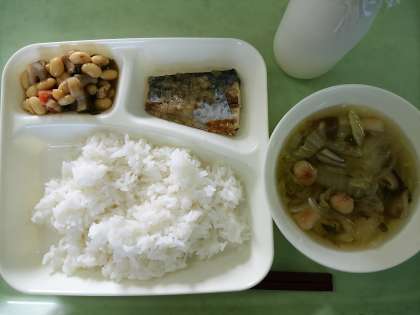 米飯・牛乳・さごしのおろしじょうゆかけ・すまし汁・五目豆です。