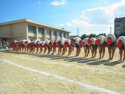 運動会の最後を締めるのは、6年生の組み立て体操です。練習では、全員ピラミッドが崩れたり、練習中にけが人が出たりしながらも、本番当日には、完璧な演技を見せてくれました。6年生の底力を見せつけられた感じです。