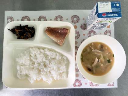 今日の献立は、あかうおのしょうゆだれかけ・豚汁・ひじきのいため煮・ごはん・牛乳です。
