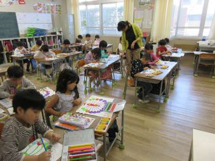 1組では図工の学習でパスを使ってクジャクに色を塗っていました。色を枠線に沿ってしっかりと塗りつぶす練習は、水彩の彩色にもつながります。みんな、集中しています。