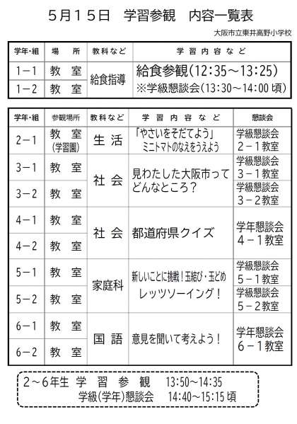 ※学習参観、懇談会の場所・内容につきましては下記の通りです。