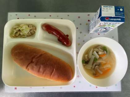 今日の献立は、ウインナーのケチャップソース・スープ・焼きツナキャベツ・黒糖パン・牛乳です。