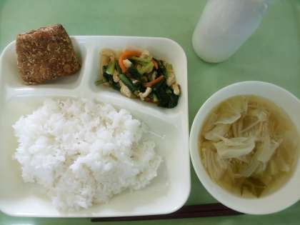 米飯・牛乳・インド風さばのサクサクあげ・すまし汁・こまつなとあげの煮ものです。