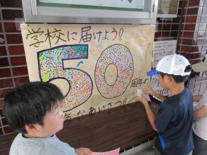 また、校内であいさつをがんばった時には、自分の学年カラーのシールを「50周年記念」の50の文字の中に貼っていき、カラフルな「50」ができあがりました。