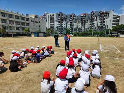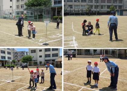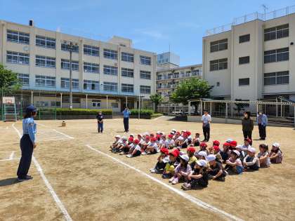 東淀川警察署の方にご来校いただき、安全な歩行についての話を聞くとともに、実際に運動場に横断歩道や信号機を準備して歩行の練習をしました。