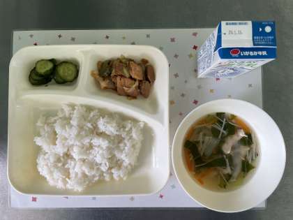 今日の献立は、ホイコウロー・中華スープ・きゅうりのピリ辛あえ・ごはん・牛乳です。