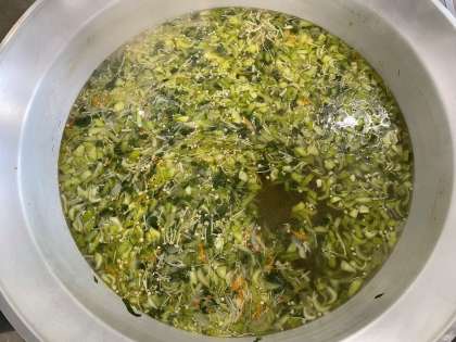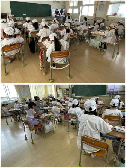 給食では、豚ばら肉をゆでてから、ほかの材料と一緒にいためています。