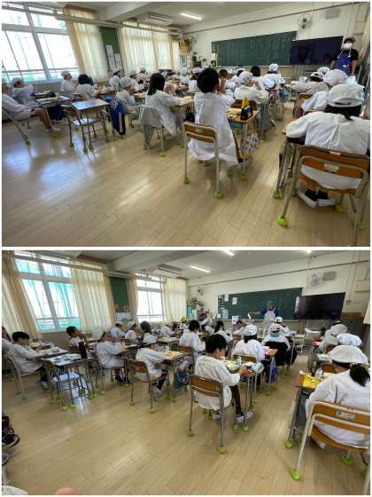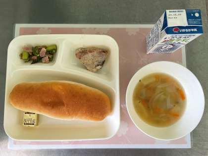 今日の献立は、かつおのガーリックマリネ焼き・押麦のスープ・グリーンアスパラガスのソテー・コッペパン・バター・牛乳です。