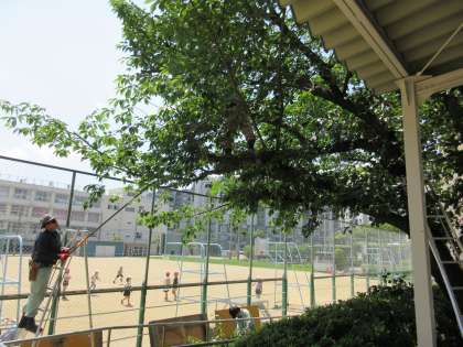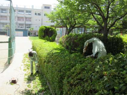 たっぷりの日差しを受けて、校内の樹木は枝が伸び、葉もにぎやかに茂りました。普段は管理作業員さんが剪定をしていますが、今週は管理作業さんに加え「大阪市校園営繕園芸事務所」から5名の方が来校され、剪定作業をしていただいています。