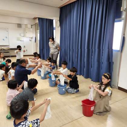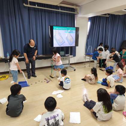 ダスキンの方が来校され、『おそうじ教室』を行ってくださりました。ほうきやちりとりや雑巾の使い方を映像や楽しい説明で教えていただきました。そして実際に、雑巾の汚れの落とし方としぼり方(たてしぼり)の練習をしました。ダスキンさんのリズミカルな声かけに合わせて、子どもたちも口ずさみながら行い、一生懸命にしぼる姿が可愛かったです。これからの掃除に役立つコツをたくさん学ぶことができました。掃除の目的『かいてき・ながもち・けんこう』を心がけ、気持ちの良い生活ができるといいですね。
