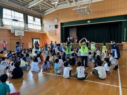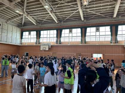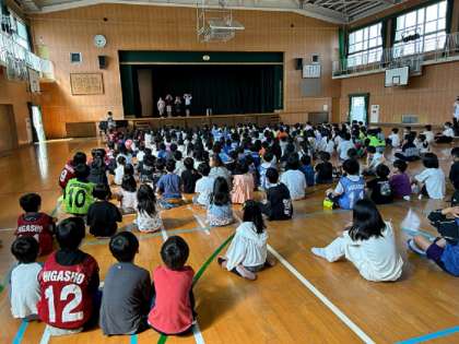 全校児童が12のたて割り班に分かれ、講堂に集まりました。児童朝会では、主にたて割り班のメンバーのことを知り、仲良くなる為の2択クイズが行われました。「犬派か猫派か」や「サッカーか野球か」「switchやスマホのゲームをするかしないか」など、計7つの質問があり、児童達は班のメンバーの答えに驚いたり共感したりしていました。
