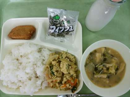 カツ丼・牛乳・みそ汁・ミニフィッシュです。