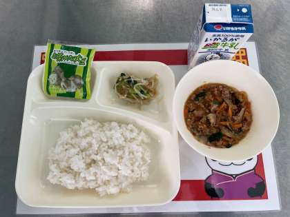 今日の献立は、マーボーはるさめ・チンゲンサイともやしの甘酢あえ・まっ茶大豆・ごはん・牛乳です。