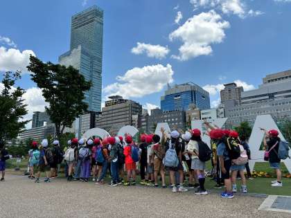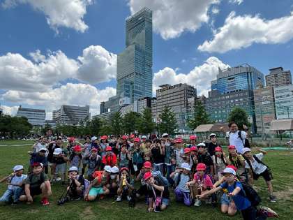 お昼は、「てんしば」でお弁当タイムをしました。みんな笑顔いっぱいに頬張っていました。帰る前にも、ハルカスを背景にみんなでパシャリ!!道中の電車内でも、大阪市の街並みを最後まで熱心に見学していました。