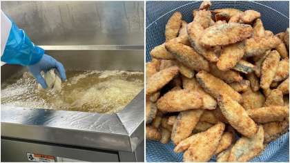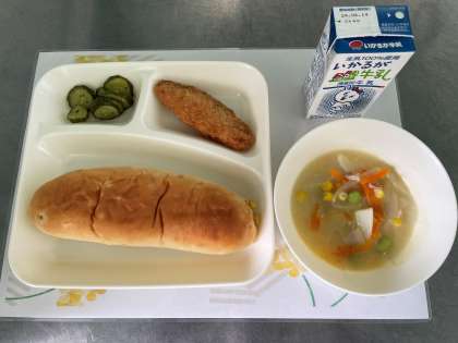 今日の献立は、サーモンフライ・豆乳スープ・きゅうりのバジル風味サラダ・おさつパン・牛乳です。