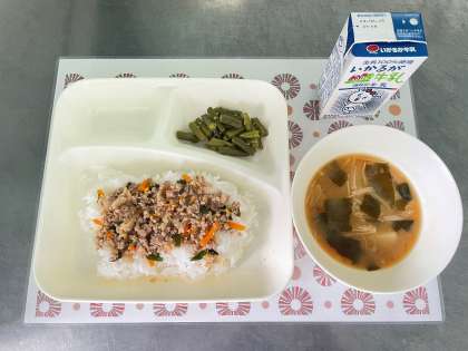 今日の給食は、豚ひき肉とにらのそぼろ丼・じゃがいものみそ汁・さんどまめのごまあえ・ごはん・牛乳です。