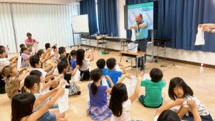 なぜそうじをするのかを確認し、ほこりをきれいに集めるためにはほうきをどう使えばよいのか、机の汚れを取るためにはどうふけばよいのかを前で見せていただきました。子どもたちも積極的に手を挙げ、授業に参加していました。