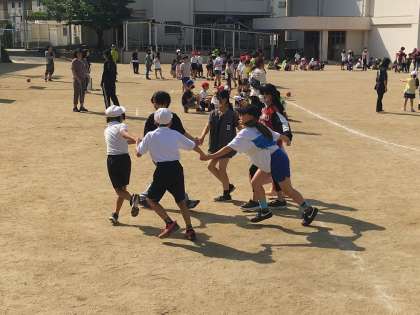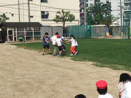 児童達は手を繋いだ状態のため走りにくい状況ではあるものの、班メンバーで協力し、散らばったボールを目指して走り、上手にボールを運んでいました。1年生から6年生まで各学年の児童が分かれているため、歩幅や足の速さの違いなどがあり、難しい様子でしたが、高学年の児童がスピードを合わせたり、近くにあるボールを取ろうと声をかけていたりと班でチームとなってビンゴを目指す様子が見られました。