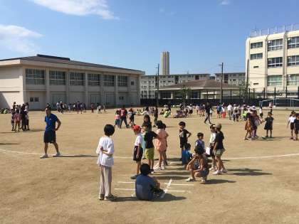 本日の集会では、「ボールビンゴリレー」が行われました。全校児童が12のたて割り班に分かれ、速さを競い合いました。「ボールビンゴリレー」では、運動場に散らばっているボールを、班で手を繋ぎ一つの円になった状態で取りに行きます。その後、各班陣地の地面に描かれたビンゴマスへ、ボールを協力して足で運びビンゴを達成する速さを競いました。