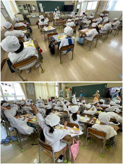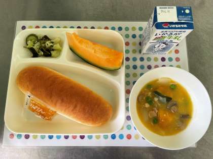 今日の献立は、鶏肉とかぼちゃのシチュー・ミックス海そうのサラダ・クインシーメロン・コッペパン・みかんジャム・牛乳です。