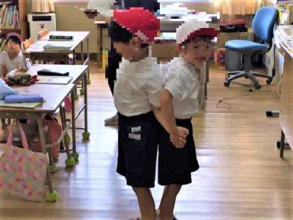 運動場での体育の学習を楽しみにしていた1年生ですが、体操服に着替えて、教室で「もうじゅうがり」や「なべなべそこぬけ」などを、友だちと一緒に楽しみながらしっかり体を動かしていました。
