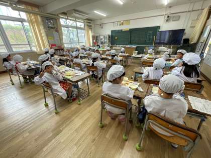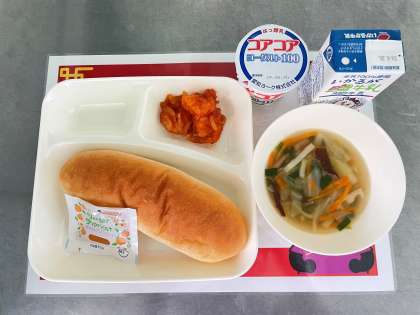 今日の献立は、えびのチリソース・中華スープ・ヨーグルト・コッペパン・アプリコットジャム・牛乳です。