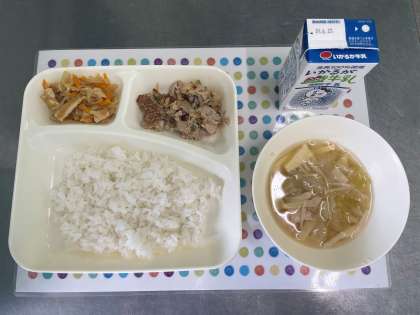 今日の献立は、豚肉のごまみそ焼き・すまし汁・切干しだいこんのいため煮・ごはん・牛乳です。