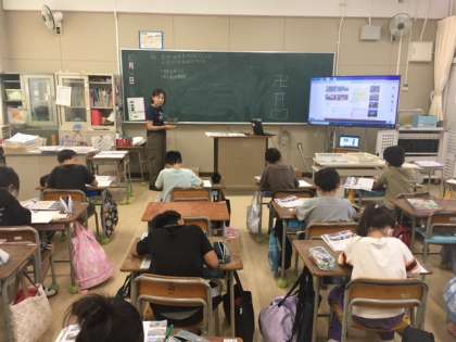 3年生の教室では、社会科の学習で「大阪市で古くから大切にされている建物」について学習していました。泉布観や中之島図書館、愛珠幼稚園や適塾など、今も現存している昔の建物を大切に守っていくことの意義を、担任の先生がアツく語っていました。