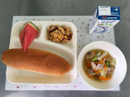 今日の献立は、チキンパエリア・ウインナーとキャベツのソテー・すいか・黒糖パン・牛乳です。