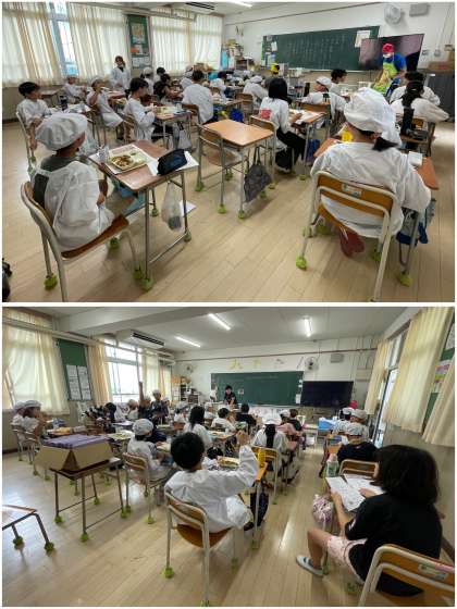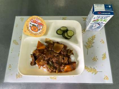 今日の献立は、夏野菜のカレーライス・きゅうりのサラダ・みかんゼリー・ごはん・牛乳です。
