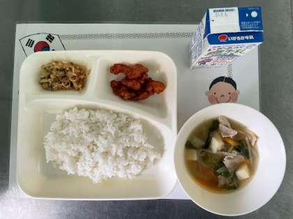 今日の献立は、ヤンニョムチキン、とうふのスープ、切干しだいこんのナムル、ごはん、牛乳です。