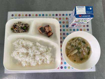 今日の献立は、さけのつけ焼き、五目汁、高野どうふのいり煮、ごはん、牛乳です。