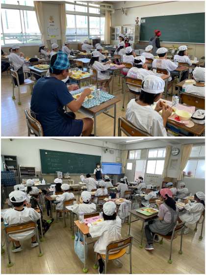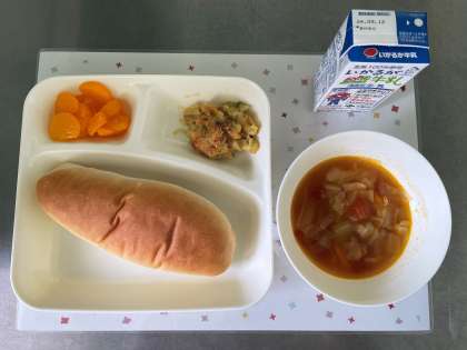 今日の献立は、カレーマカロニグラタン、トマトスープ、みかん(缶)、コッペパン、いちごジャム、牛乳です。