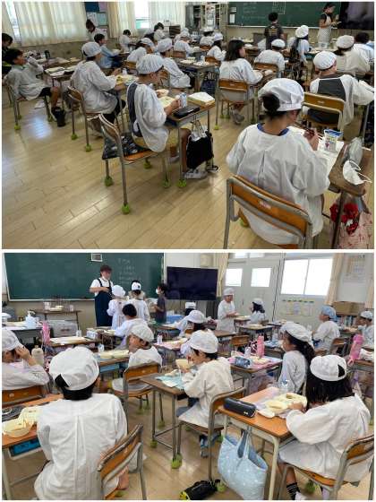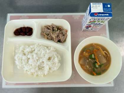 今日の献立は、豚肉の甘辛焼き、とうがんのみそ汁、金時豆の煮もの、ごはん、牛乳です。