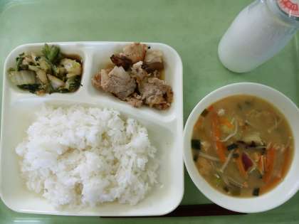 米飯・牛乳・豚肉のしょうが焼き・さつまいものみそ汁・菊菜と白菜の胡麻和えです。
