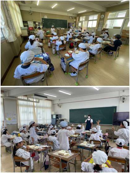 今日の給食には、「一口がんもとさといものみそ煮」、「みたらしだんご」が出ました。