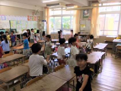 1年1組の教室からは「さんぽ」のリズムが聞こえてきました。子どもたちがリズムに合わせて教室の中を整然と?行進しています。みんな楽しそうな顔です。