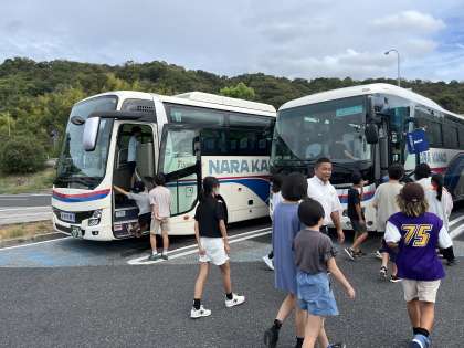 バスの中では、なぞなぞ大会をしたり、平成のアニメソングを流したりして盛り上がってます。