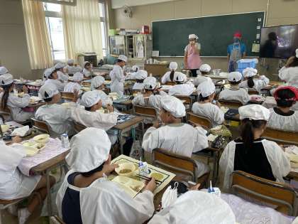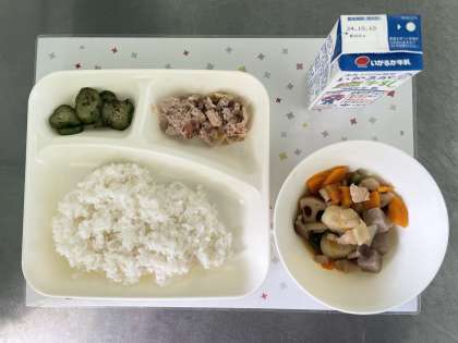 「ふきよせ(ふき寄せ)」は、秋から冬の初めにかけて使われる料理の名前です。風にふき寄せられた落ち葉を思わせるように、秋の味覚を盛り合わせた煮物のことを「ふきよせ煮」といいます。今日の給食では、さといも、れんこん、しめじを使っています。