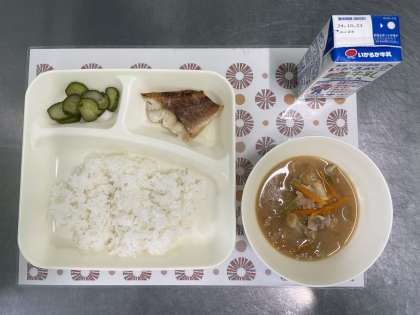 今日の献立は、あかうおのしょうゆだれかけ、豚汁、きゅうりのゆず風味、ごはん、牛乳です。