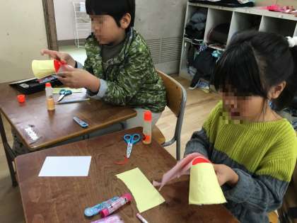 2年2組の授業では紙コップを使って、サンタクロースを作りました。