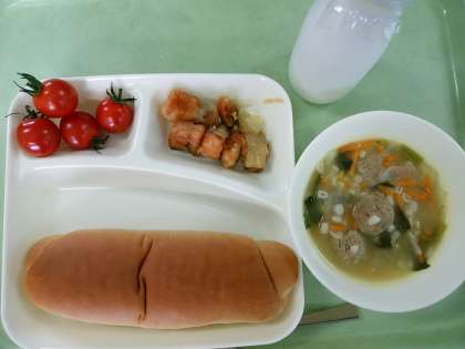 パン・牛乳・さけのマリネ・肉団子と麦のスープ・プチトマトです。