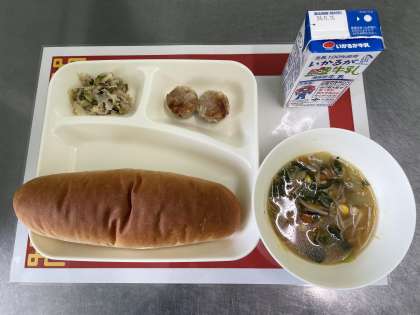 今日の献立は、焼きシューマイ、中華みそスープ、ツナと野菜のオイスターソースいため、黒糖パン、牛乳です。